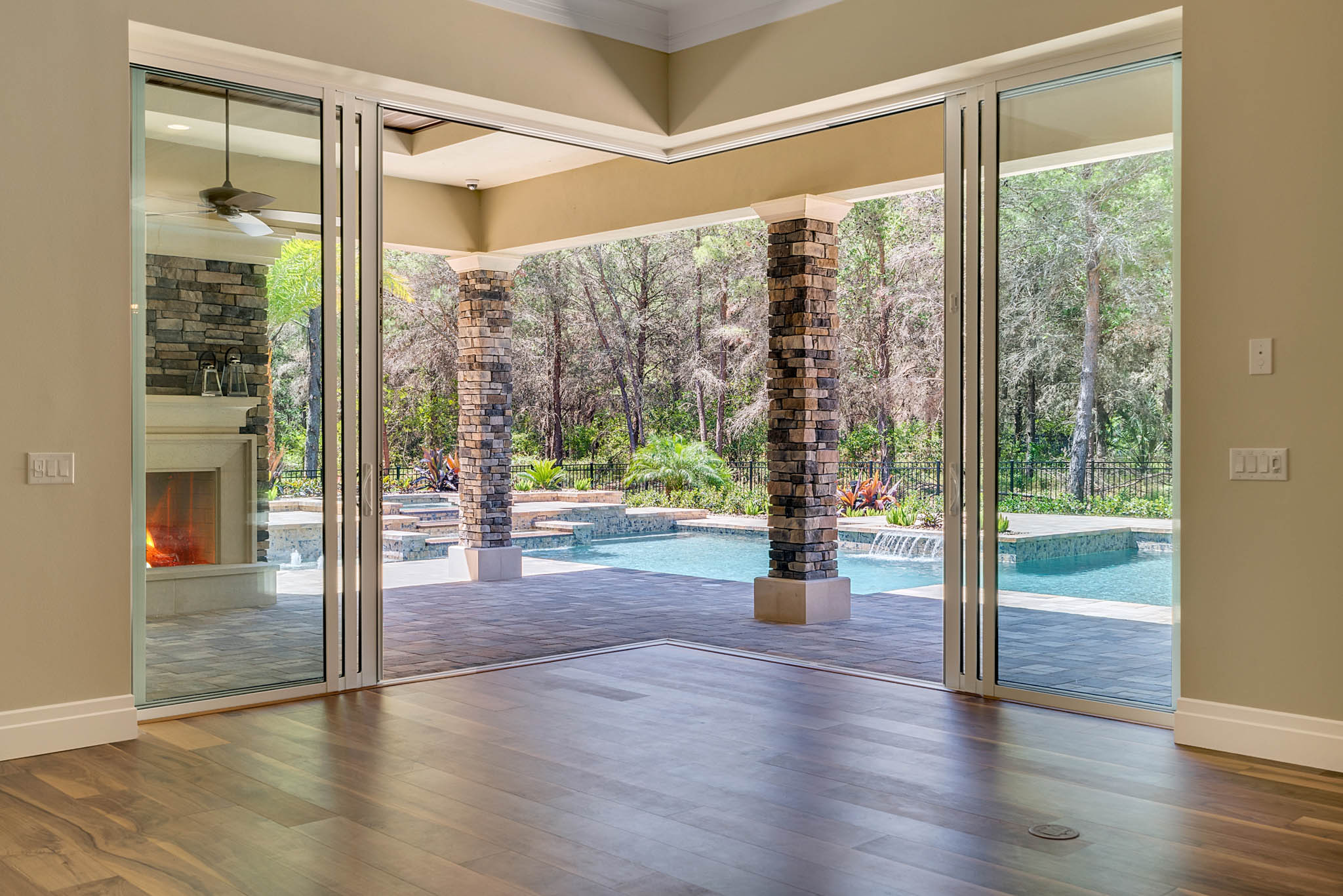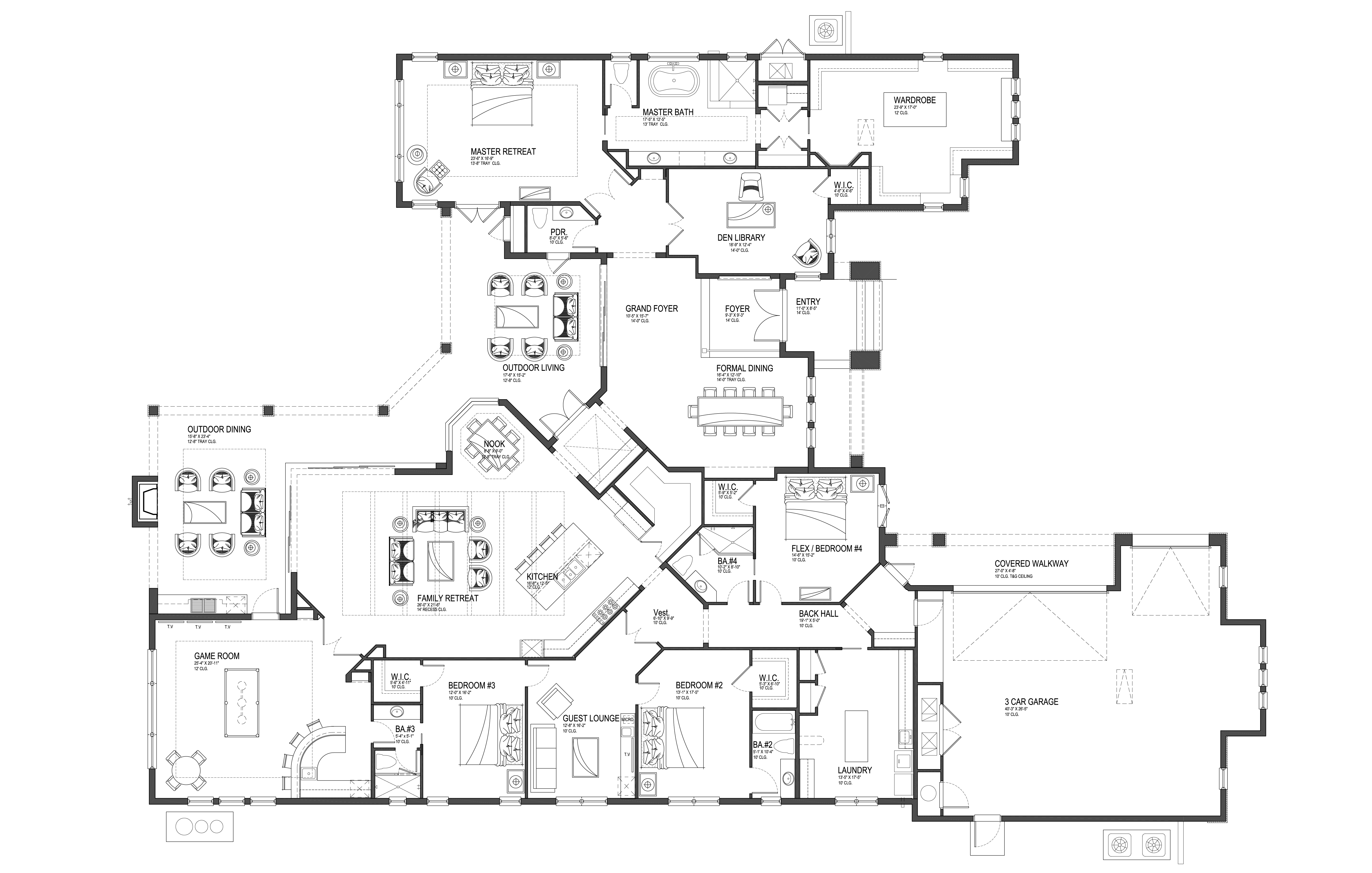 • Covered Poolside Outdoor Resort with outdoor fireplace, Cast Stone Surrounds, Complete summer Kitchen cafe, and plenty of room for comfortable furnishings, tables, chairs, and TV.