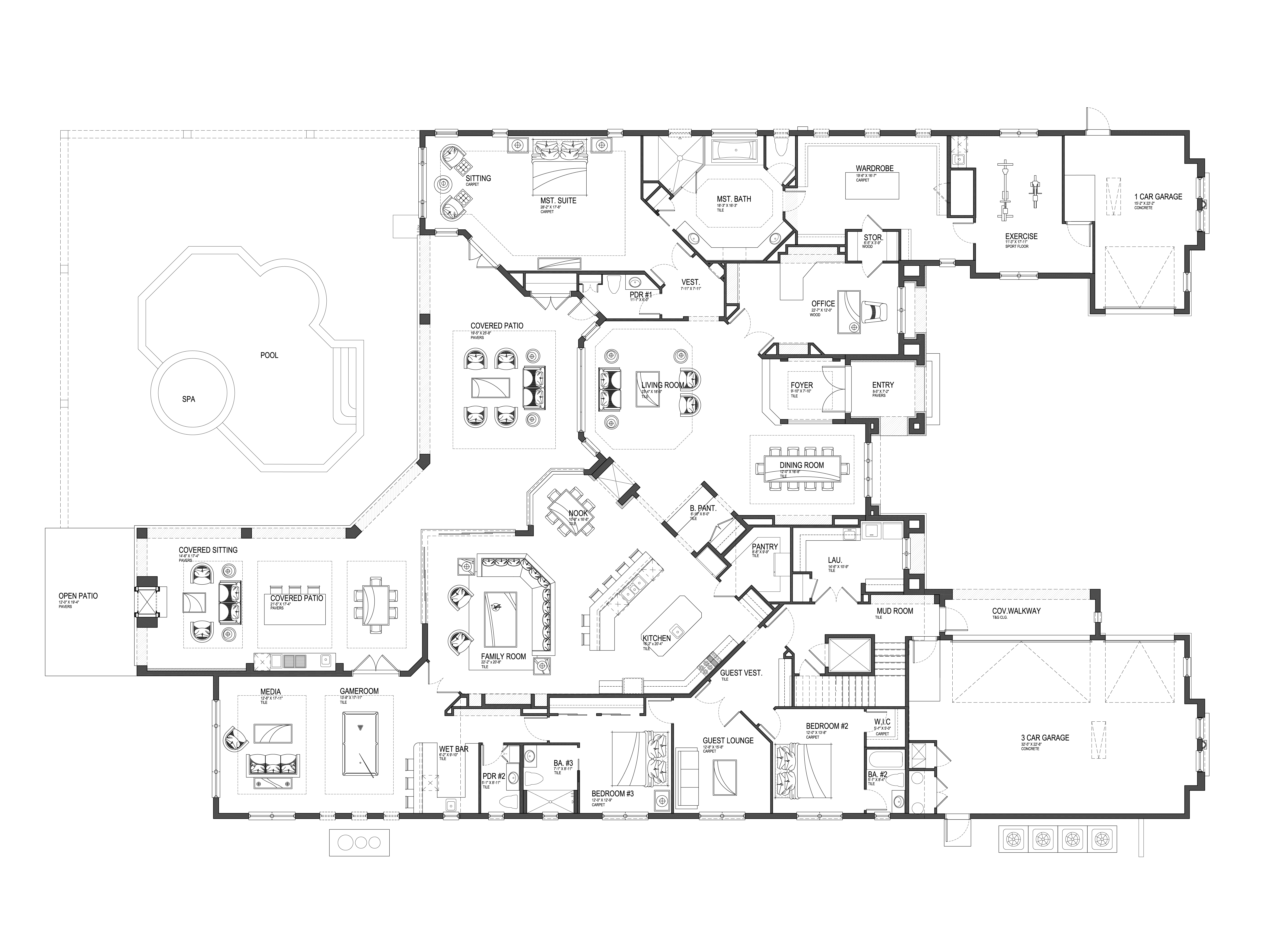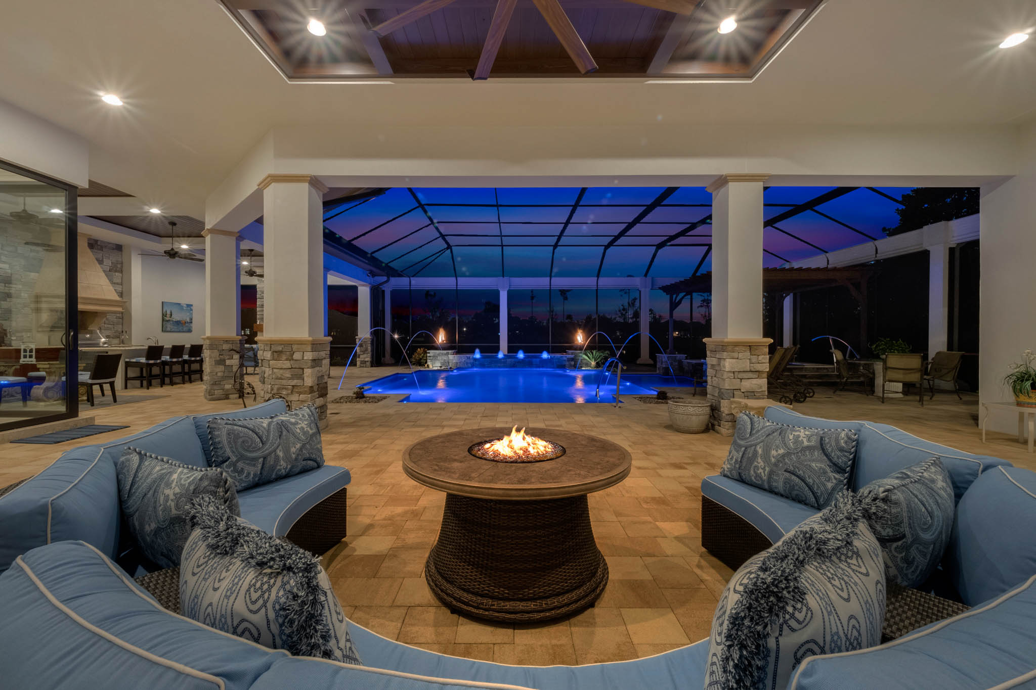• Covered Poolside Outdoor Resort with outdoor fireplace, Cast Stone Surrounds, Complete summer Kitchen cafe, and plenty of room for comfortable furnishings, tables, chairs, and TV.
